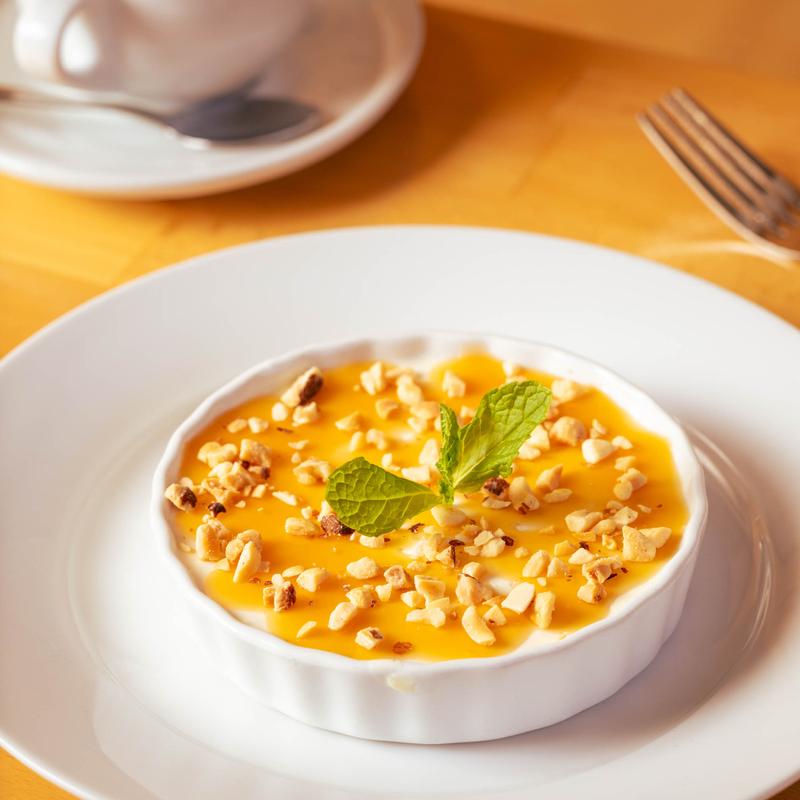 Vanilla-infused Italian custard made with cream, topped with a choice of homemade culis & strawberry or caramel & nuts.