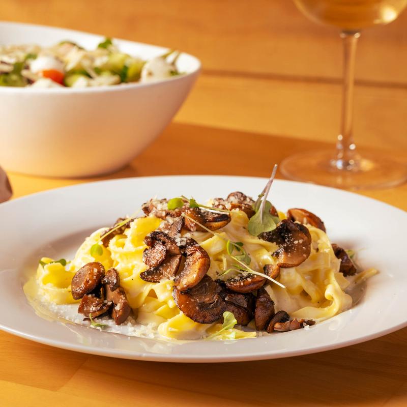 Homemade fettuccine, cream sauce, sautéed mushrooms, parmesan cheese, and walnuts.