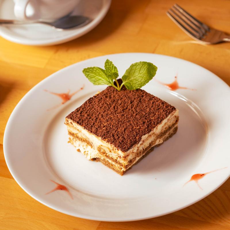 Layers of creamy mascarpone custard set atop espresso-soaked ladyfingers topped with cocoa powder.