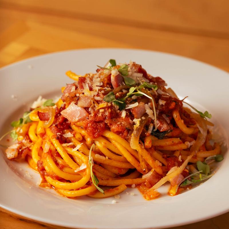 Bucatini, pancetta, onions, tomato basil sauce, and pecorino cheese.