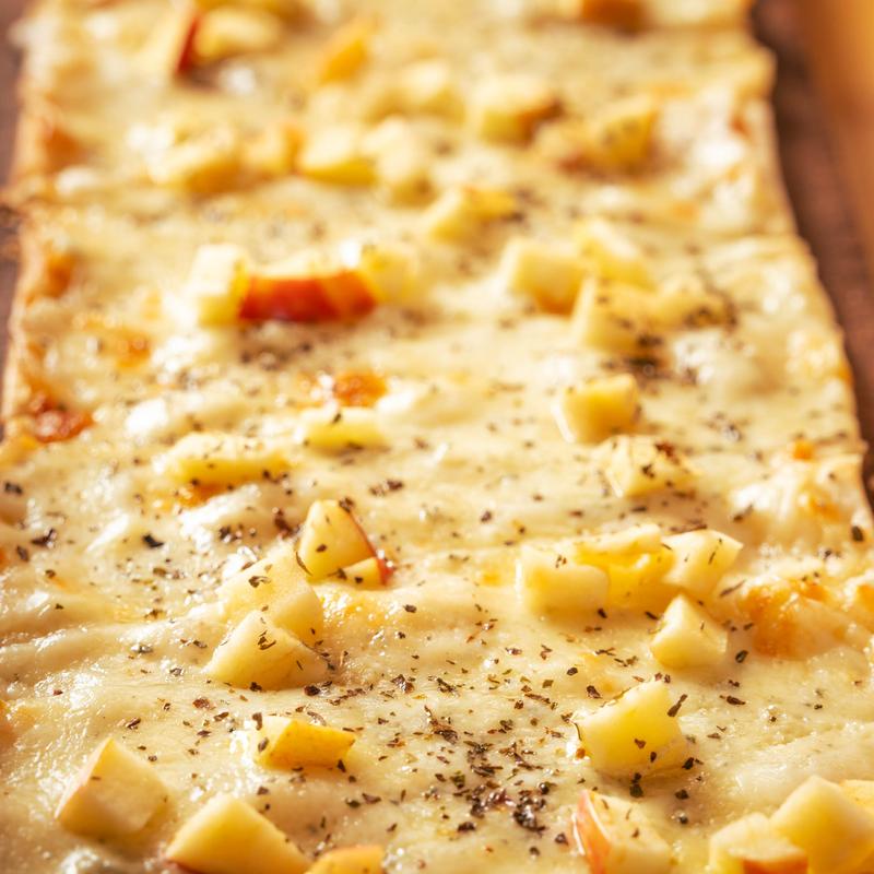 Flatbread, mozzarella, gorgonzola doc, parmesan, garnished with sliced apple and basil.
