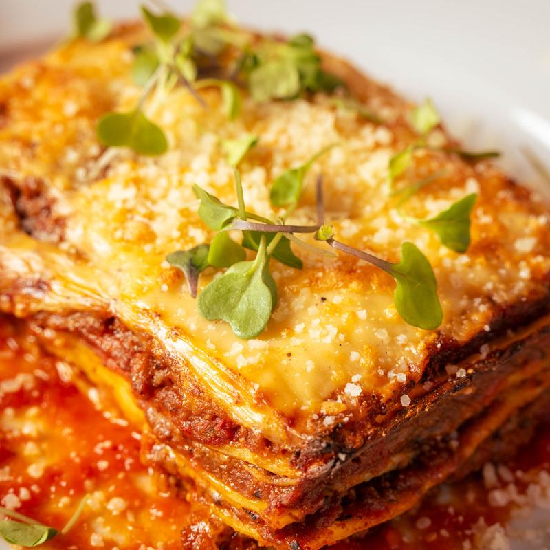 Homemade lasagna sheet, Bolognese sauce, mozzarella, besciamella, and parmesan.