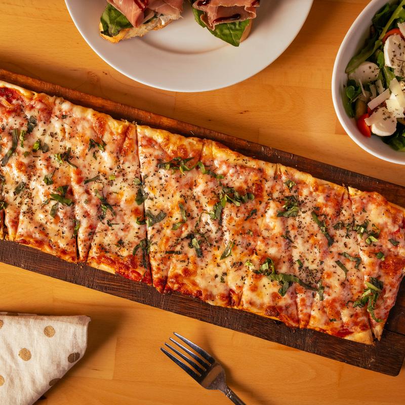 Flatbread, tomato sauce, mozzarella, and fresh basil.